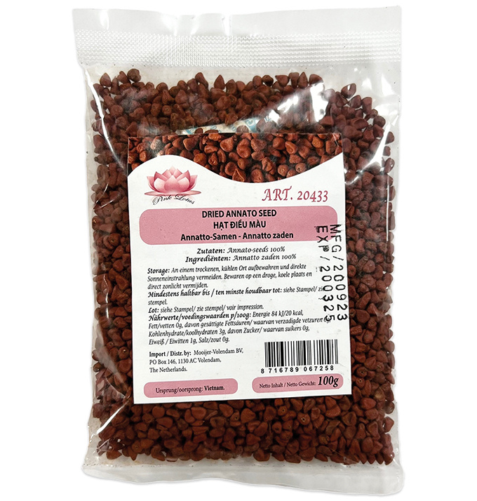 Descriptionoutlet: Dried Annato Seeds 100g Pink Lotus bag THT 20.03.25