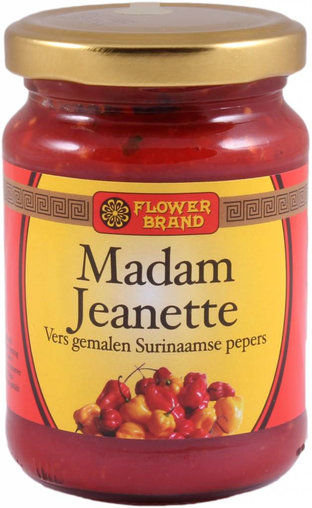 Flower Brand Madam Jeanette sambal 200 grams. Freshly ground Surinamese peppers, very hot!