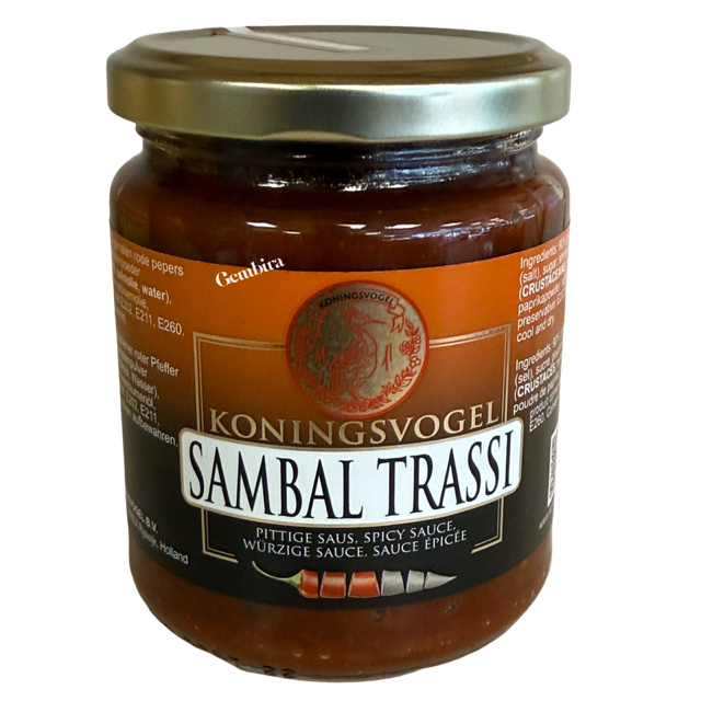 Sambal Trassi Koningsvogel is a spicy Indonesian sambal made with trassi, fermented shrimp, and spices. Serve with rice, other dishes, etc.