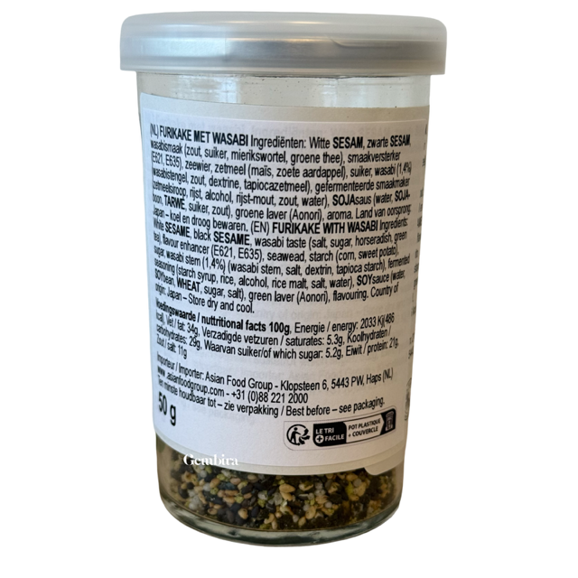 Furikake Wasabi van Nihonkaisui zijn rijstkruiden combineren de pittigheid van wasabi met de hartige smaak van zeewier, perfect om je rijstgerechten een extra kick te geven. Of je nu een sushi-liefhebber bent of gewoon je dagelijkse kookkunsten wilt opfle