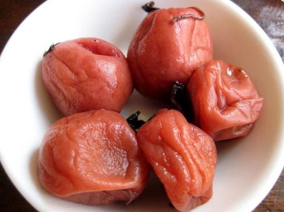 Japanse abrikozen (梅 ume) worden gedroogd en gepekeld in zout, waarna ze rood worden gekleurd door de bladeren van shiso. Umeboshi zien er uit als kleine gerimpelde rozerode olijfjes en smaken zoutig en zuur. Umeboshi worden met rijst gegeten.