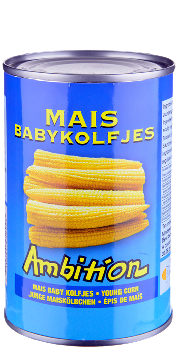 Young Corn - Mais Baby Kolfjes Ambition 425gr / Uitgelekt 200gr Jonge baby mais kan worden gebruikt in salades, roerbakmaaltijden, hot pot en in oosterse snacks of maaltijden. diverse mogelijkheden.